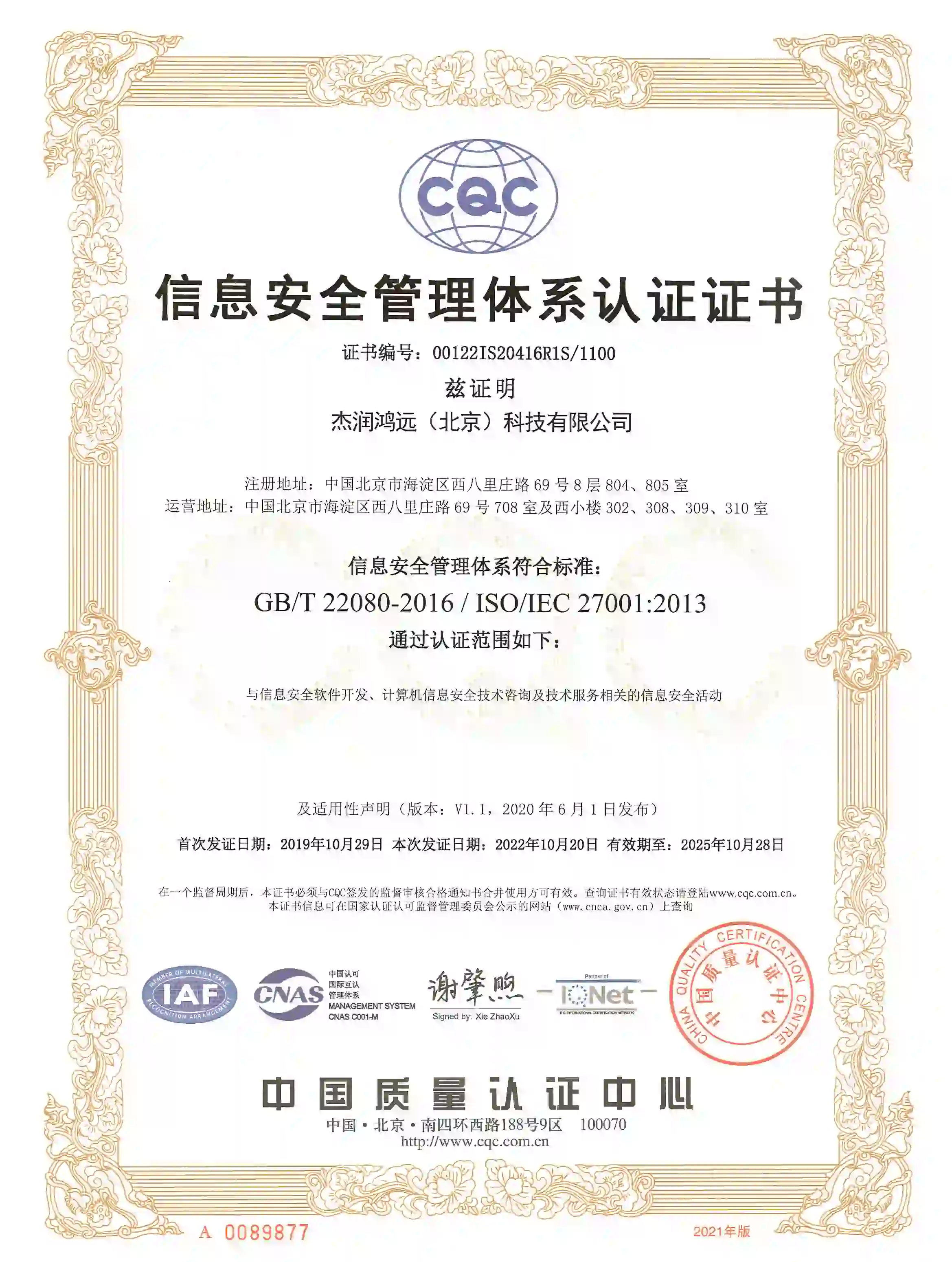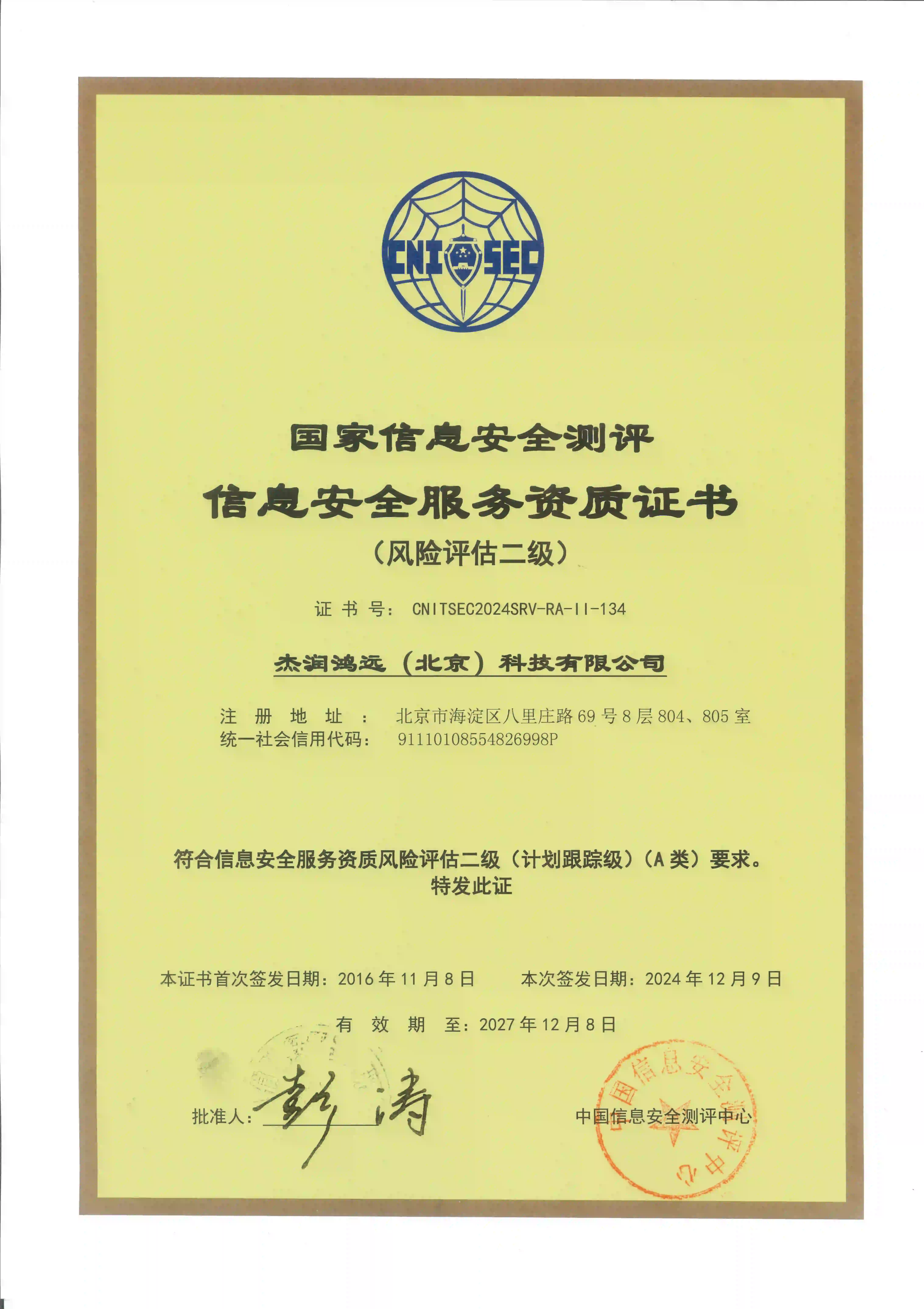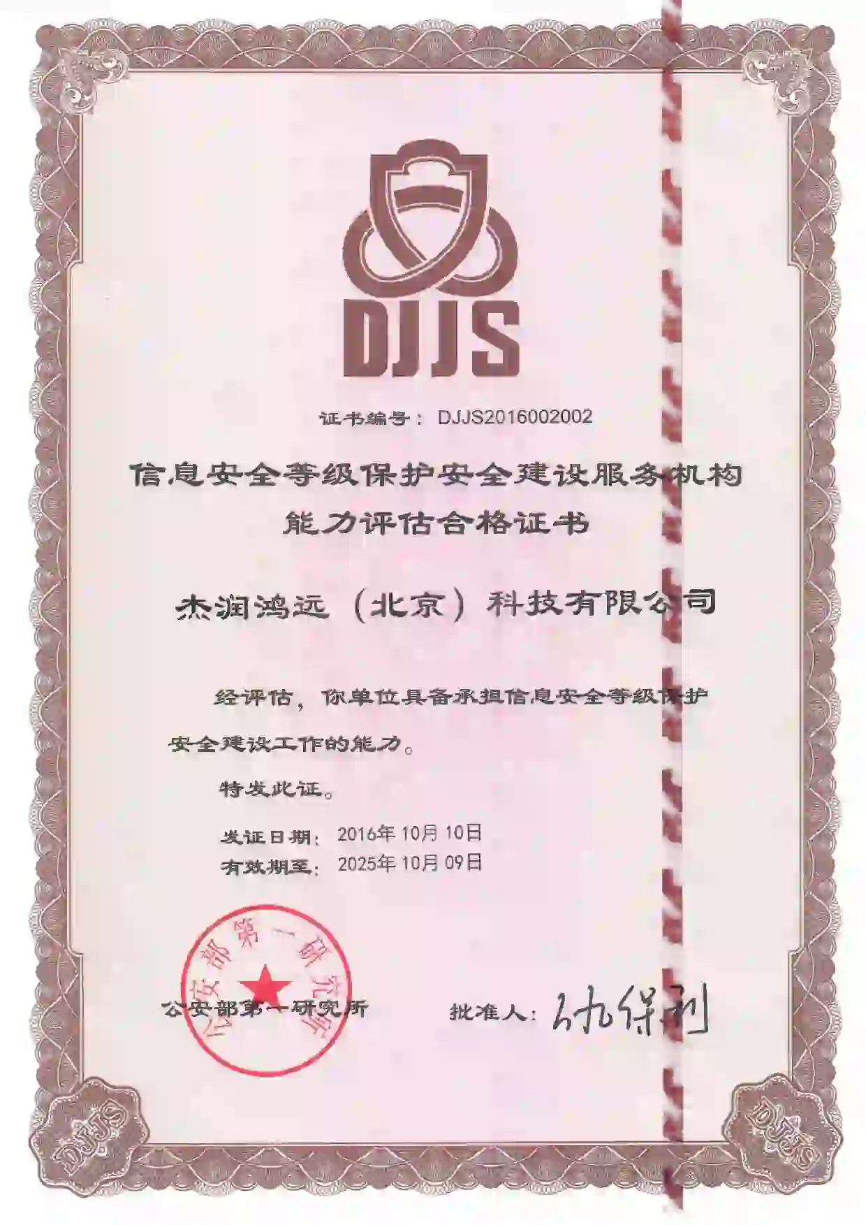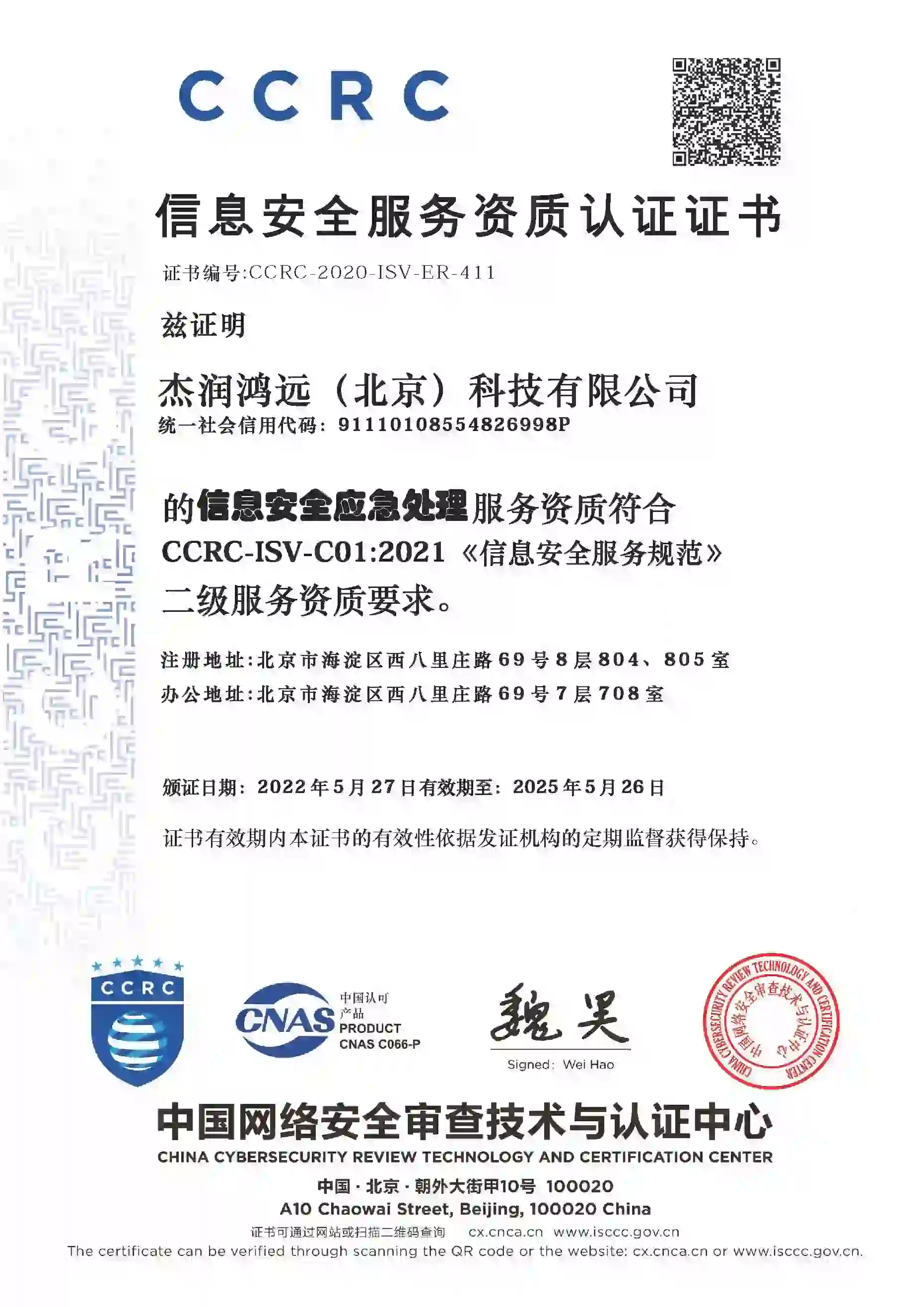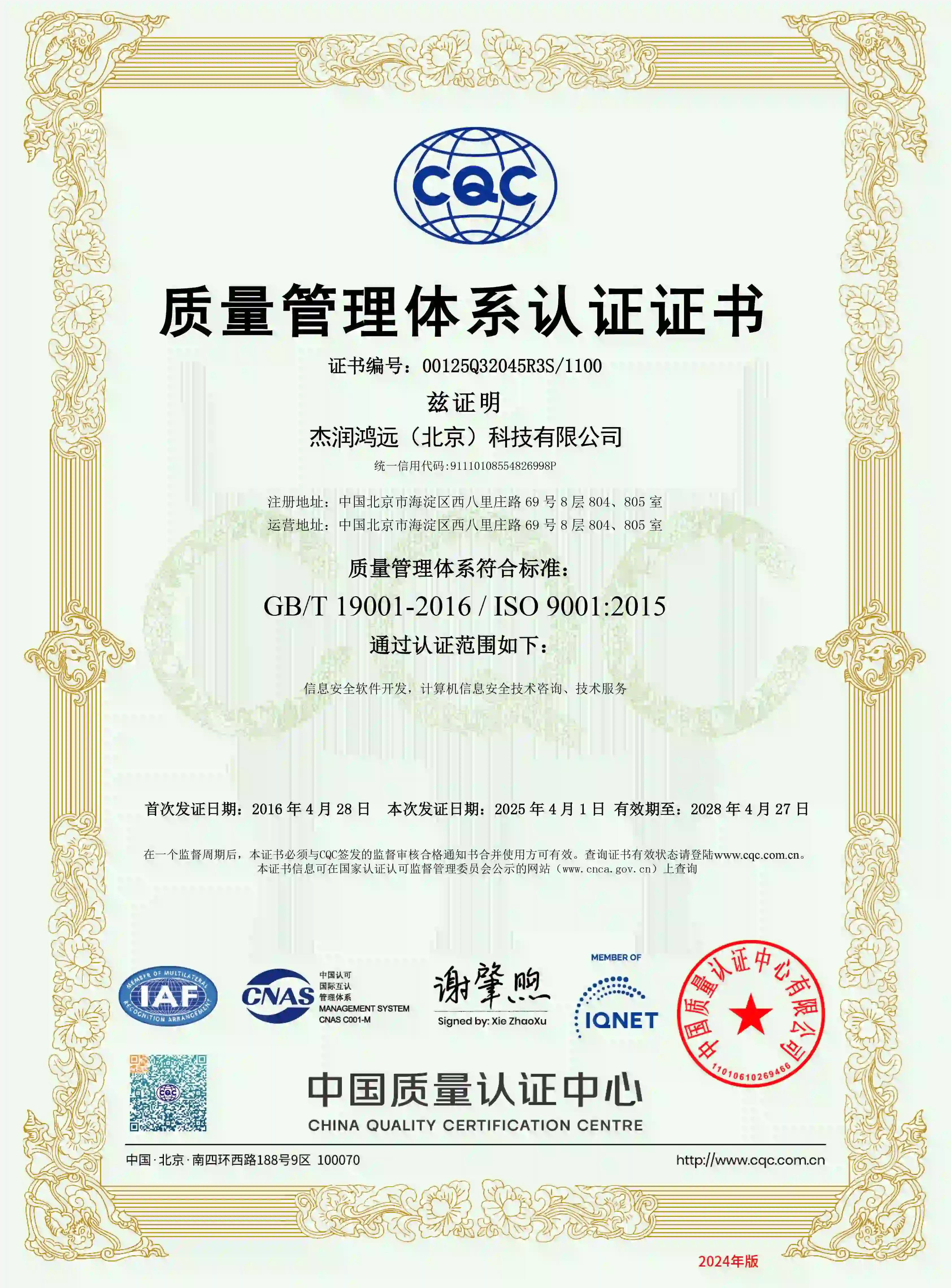 Jierun Hongyuan takes the *Cybersecurity Law* as its foundation and the Cybersecurity Classified Protection 2.0 standard as its implementation framework, focusing on the implementation of cybersecurity systems for government and enterprise clients. The company holds professional qualifications in classified protection construction, risk assessment, emergency response, etc., has obtained ISO 27001 and ISO 9001 certifications, and possesses full-stack service capabilities in security engineering, integration, and operation & maintenance.